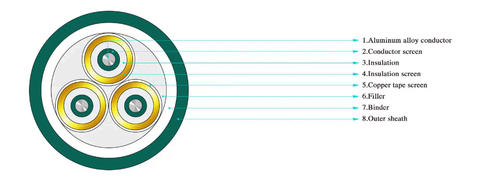 ·Трёхжильный силовой кабель с изоляцией из сшитого полиэтилена для номинального напряжения от 3,6/6 кВ~26/35 кВ.